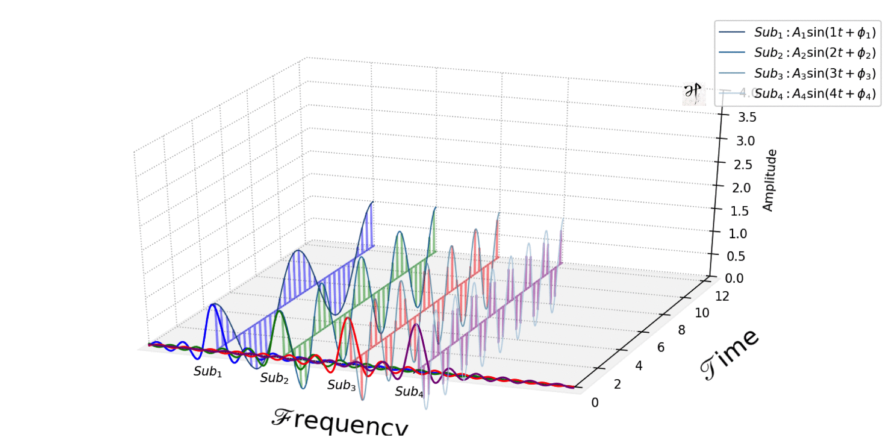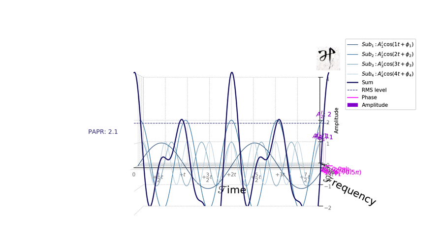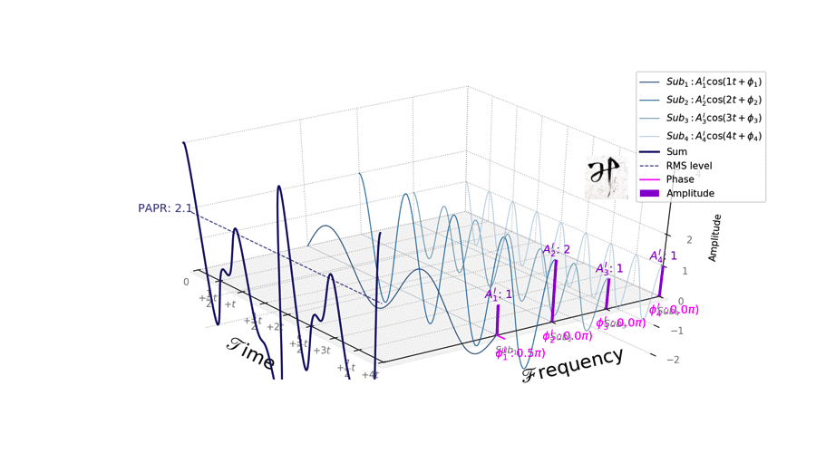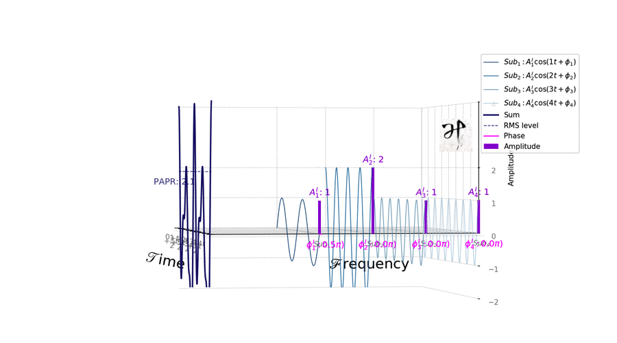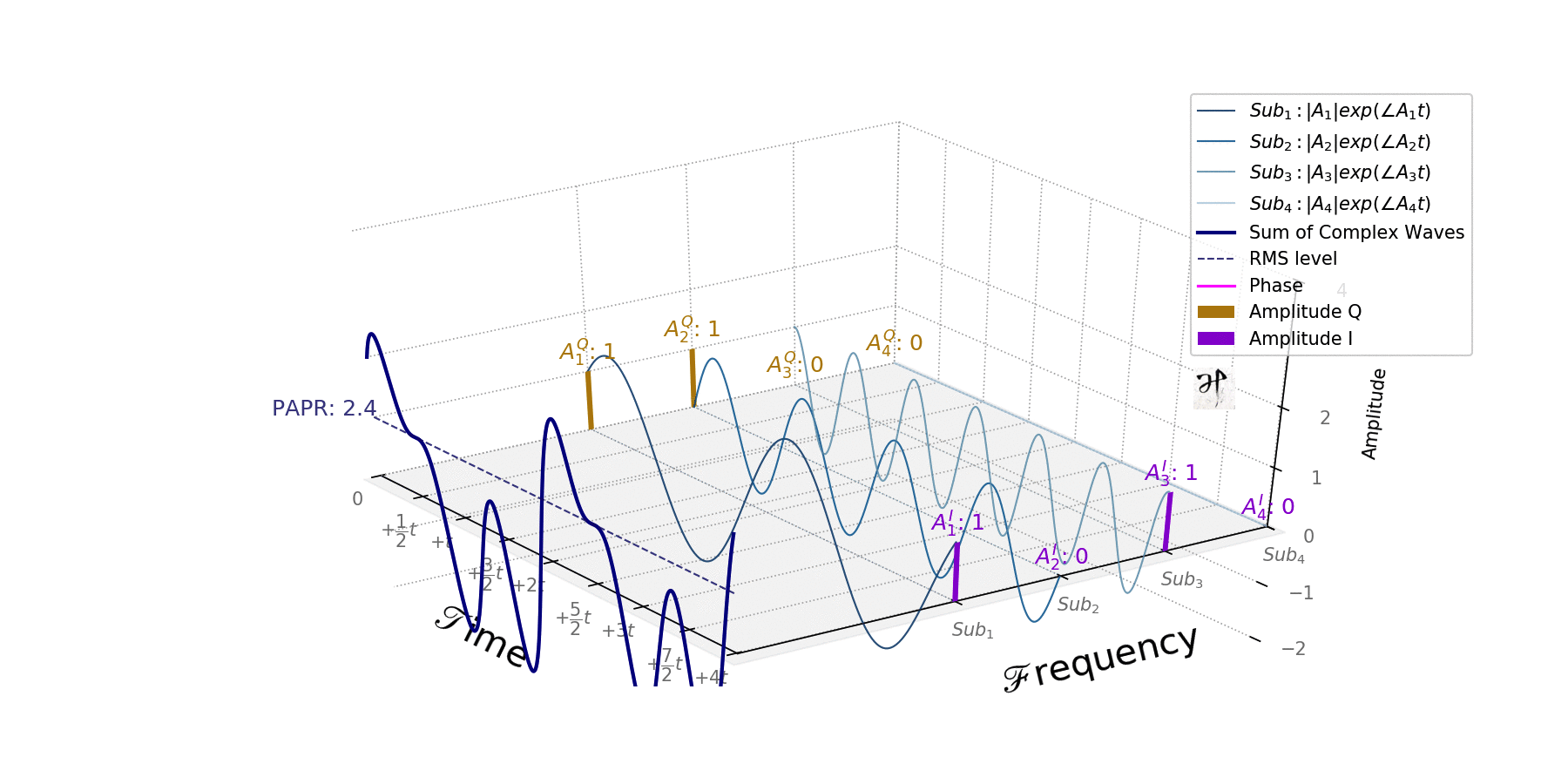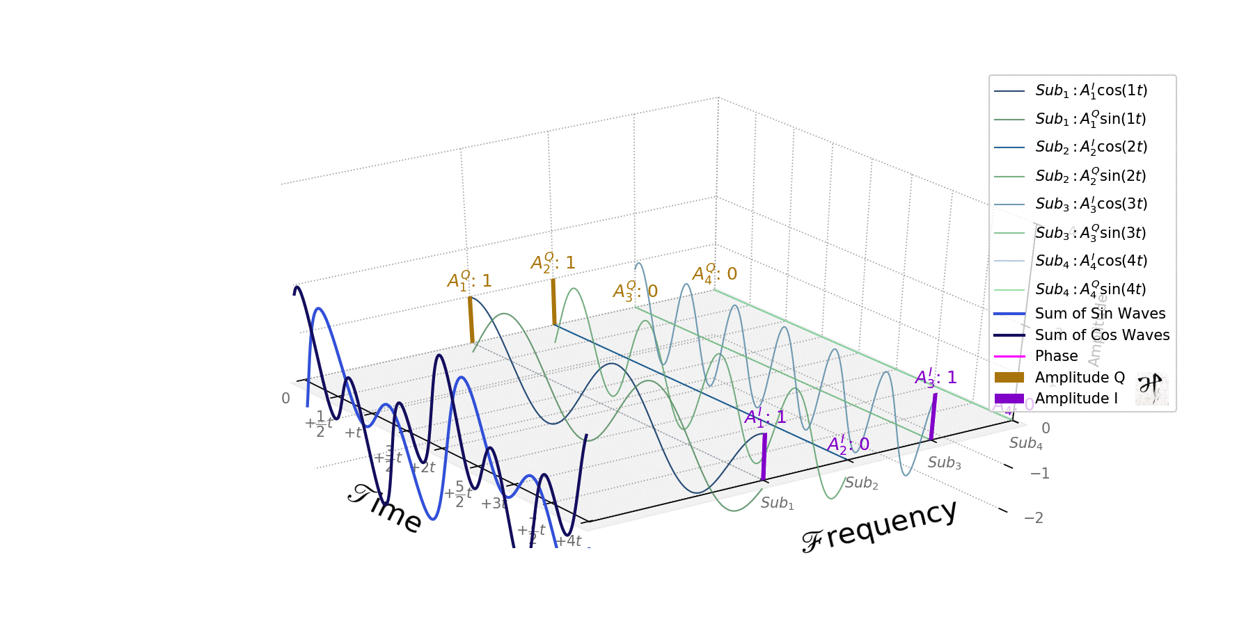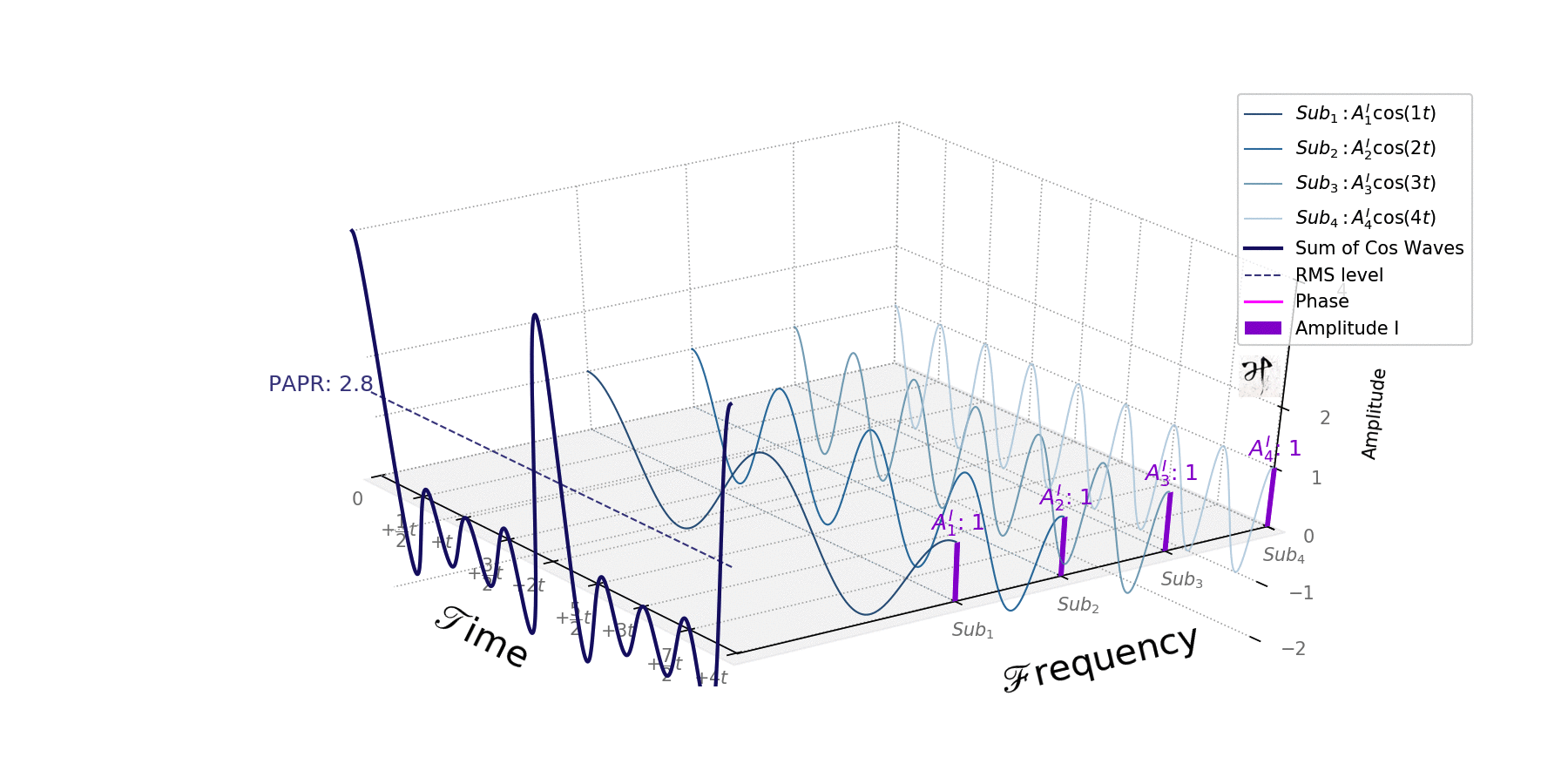 上图展示了四个余弦波(也叫In phase)谐波,每个波的频谱都是1,所以可以看成是信息(1,1,1,1)。每个波的振幅取值范围是0或者1的话,这四个波就可以传递4bit的信息。也就是每个谐波都是一个ASK。