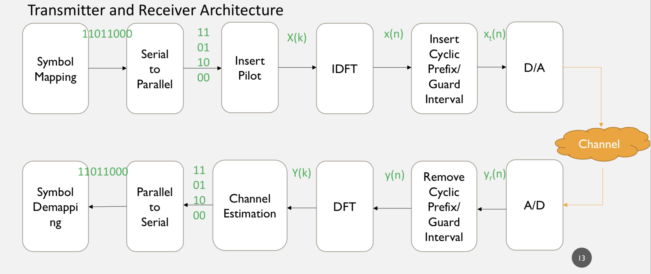 以传输11011000为例,首先分成11,01,10,00并列的四个symbol,然后加入pilot(以后有空再谈),对四个复数symbol进行IDFT_IFFT就可以得到时域的实际发送的信号,然后再加入CP_GI,最后转换成数字数据,升到中频/高频后发送。接收器是倒过来的操作。