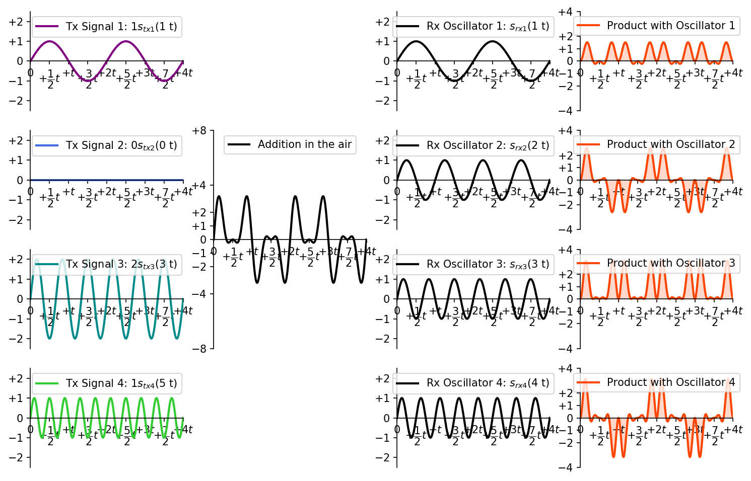 了解不同频率的正弦余弦的正交性这一点之后,我们就可以同时利用这个特征同时发送不同频率的正弦余弦波。而在接收器一侧,使用不同频率积分器积分之后,我们是有能力分辨出不同频率谐波。